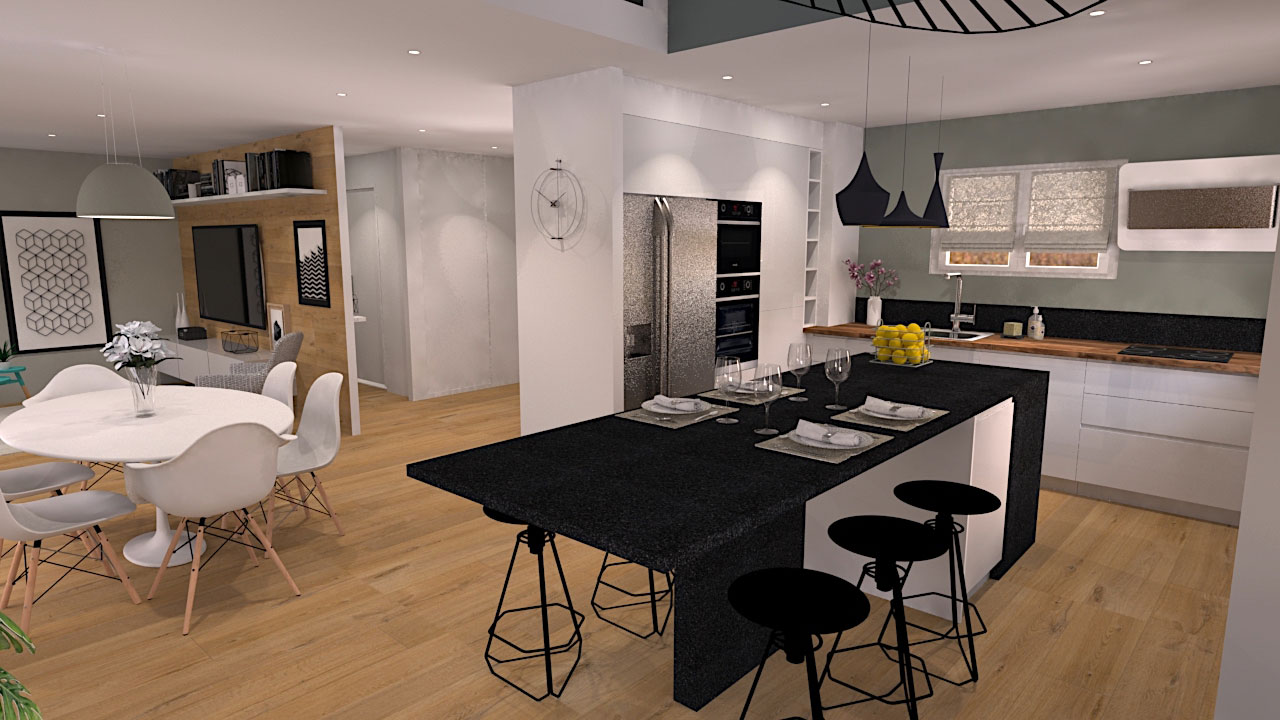 L’étage est dédié aux pièces de vie. La cuisine moderne avec îlot central s’ouvre sur un séjour salle à manger lumineux.
