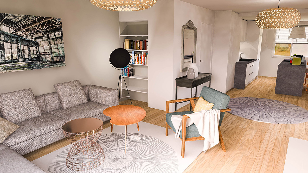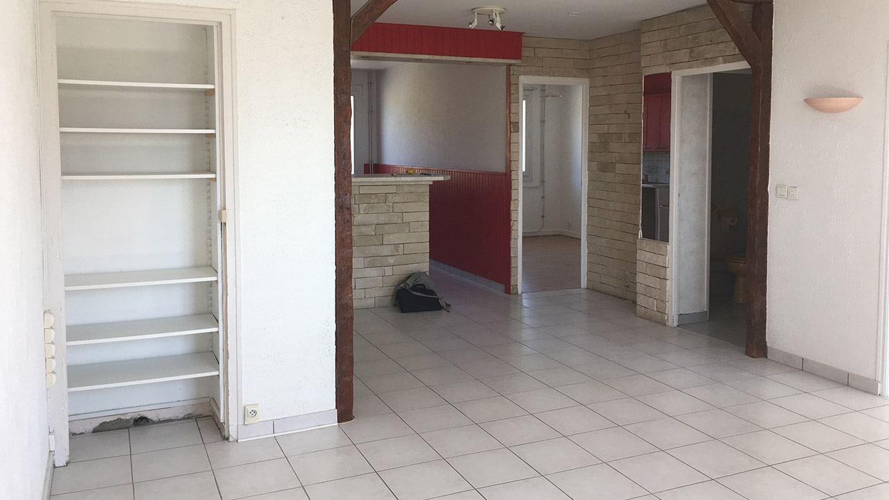 Ce T3 avait une chambre donnant accès directement dans la pièce de vie et une petite cuisine en couloir. La pièce de vie était divisée en deux avec une double porte qui rendait l’agencement mobilier assez difficile.