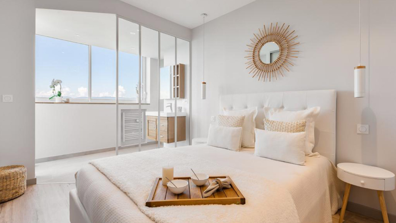Une verrière vient séparer ces deux espaces apportant une grande luminosité à la chambre. Une chambre a été créée dans l’ancien salon et bénéficie de la baie vitrée du balcon donnant sur le lac.